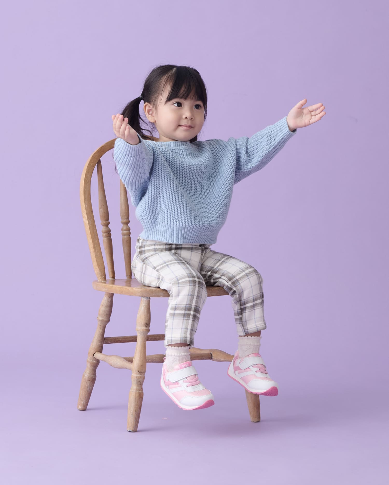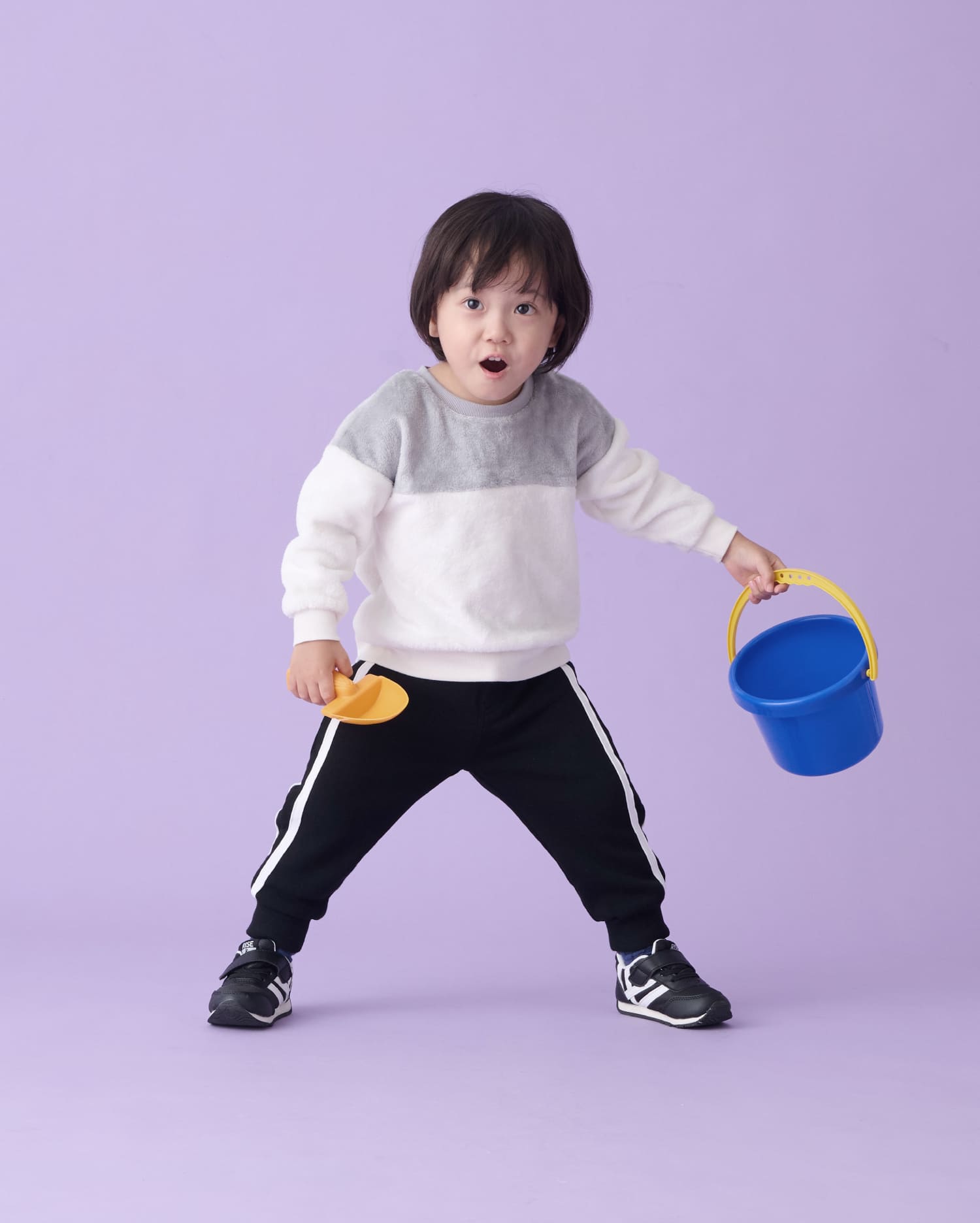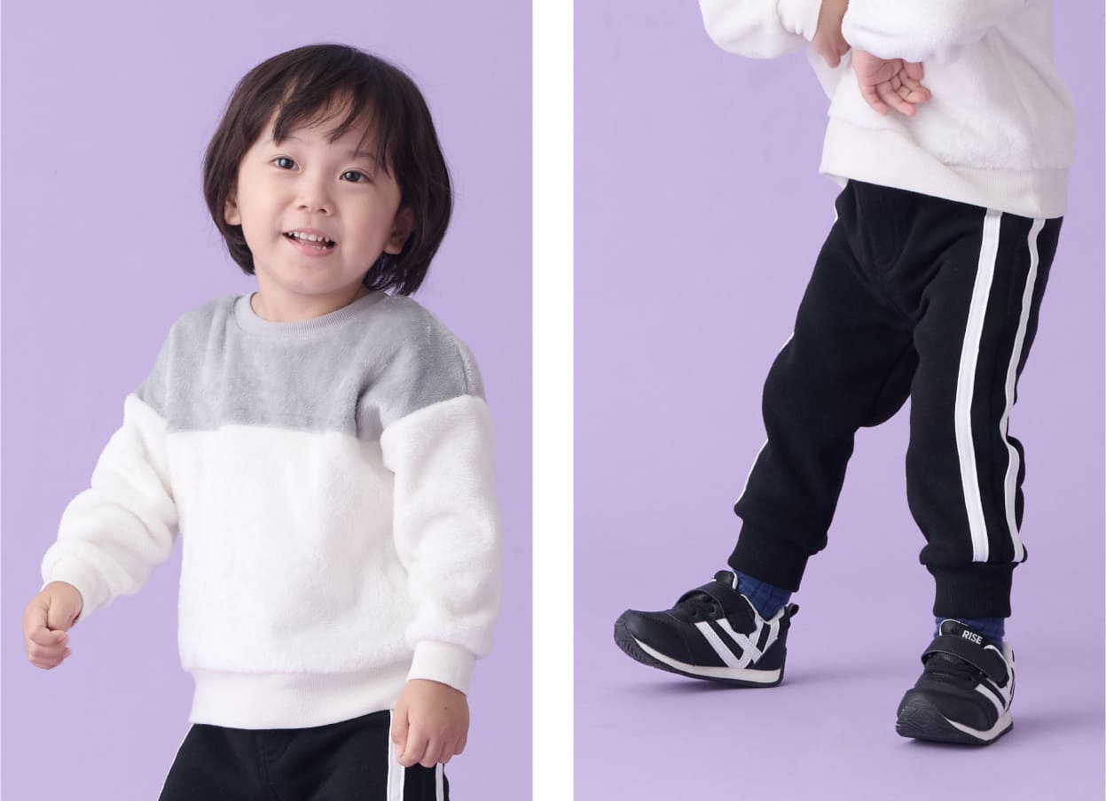 もこもこのあったかトレーナーで冬らしさを出しつつ、サイドライン入りのスウェットパンツでスポーティーに。トップスは、グレーの配色切り替えがアクセントになっています。