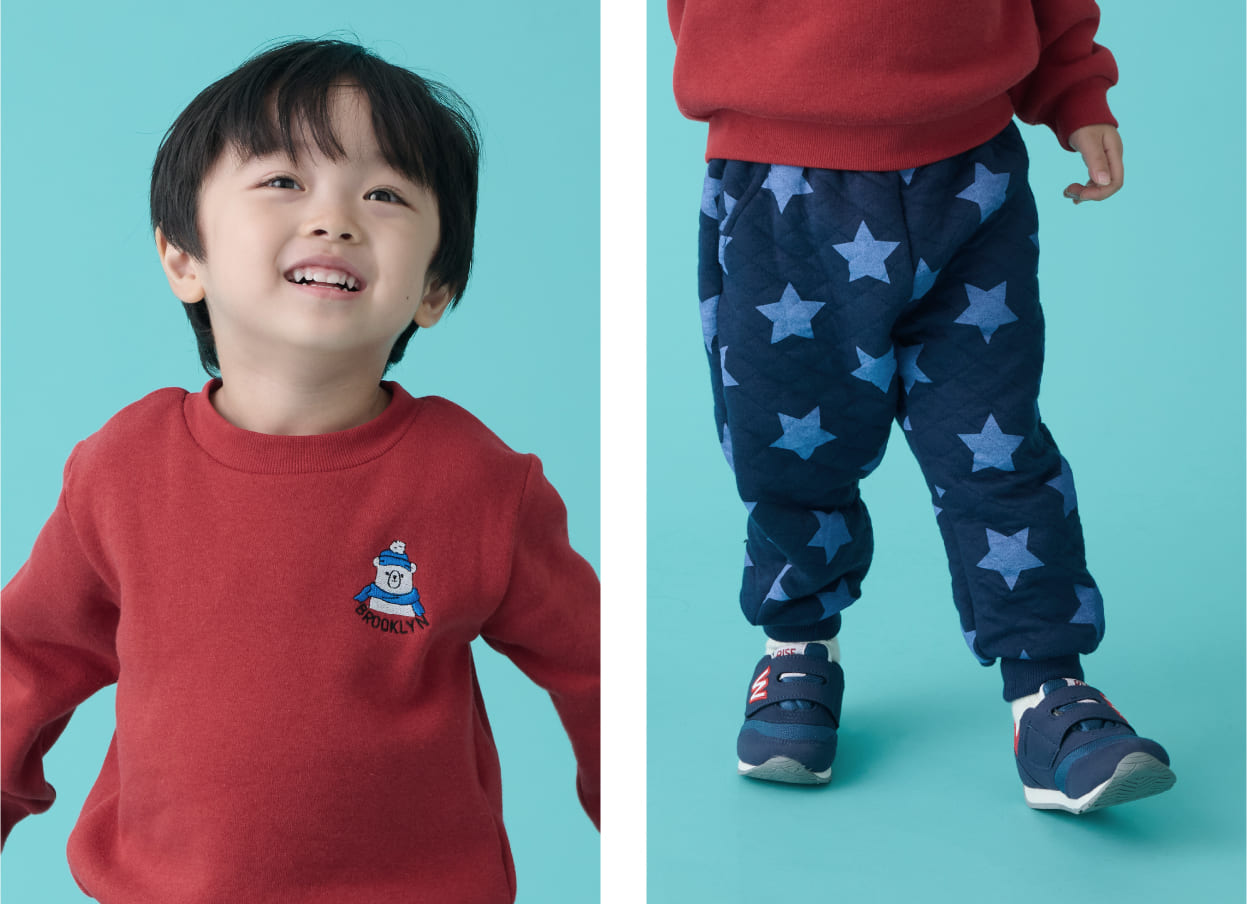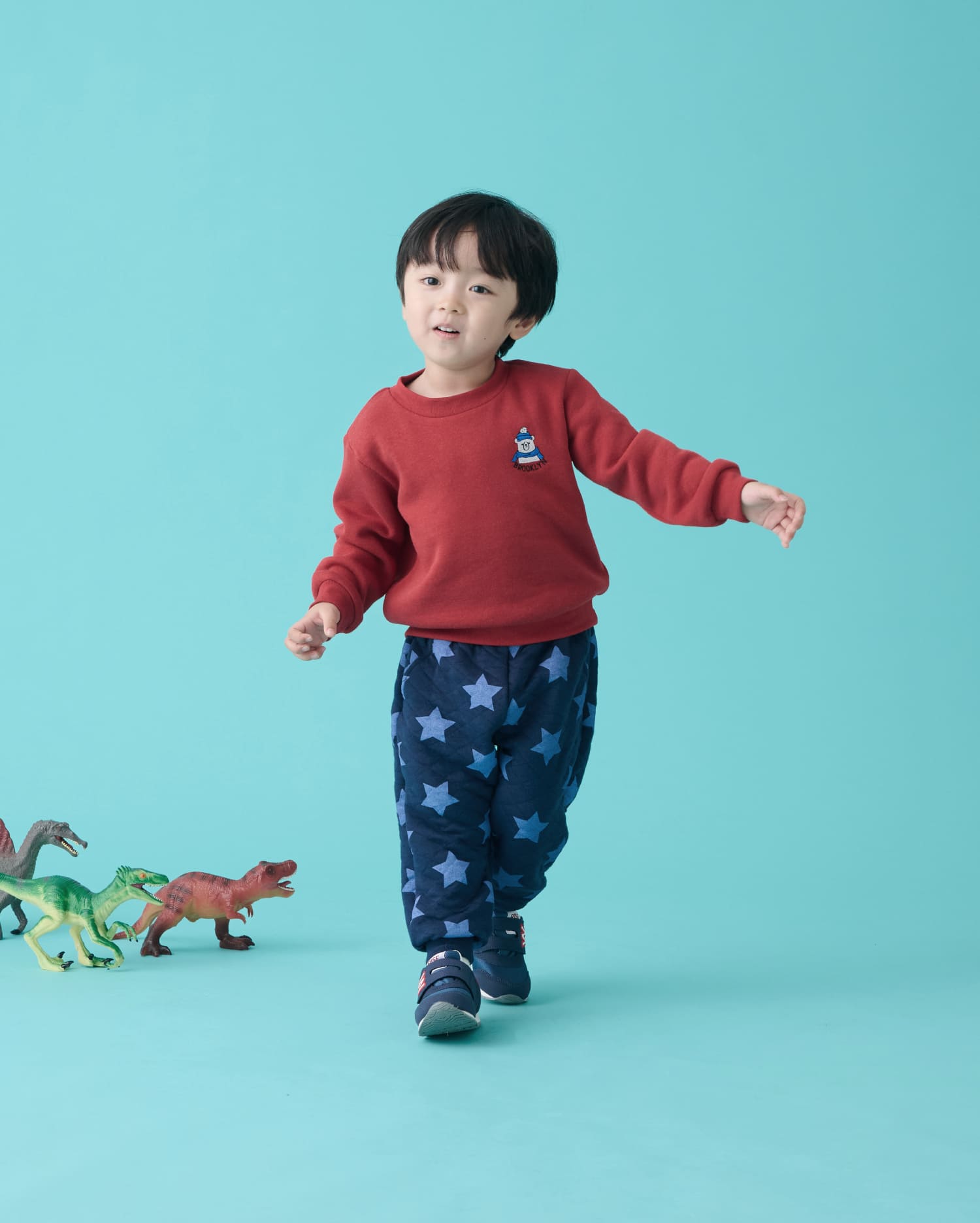 シロクマのワンポイントが目を引くトレーナーに、スターの総柄パンツを合わせてポップな印象に。パンツは、柔らかな着心地と保温性を兼ね備えたキルティング素材です。