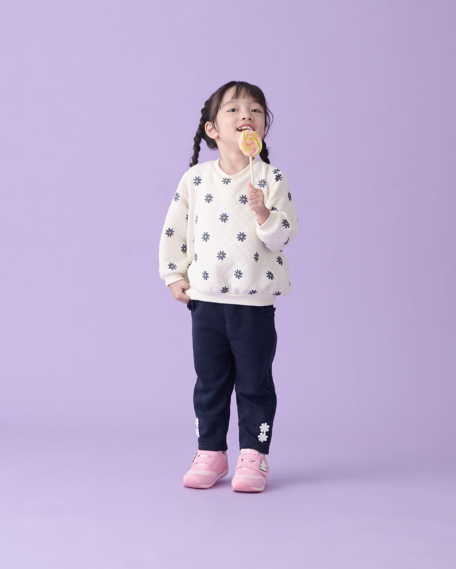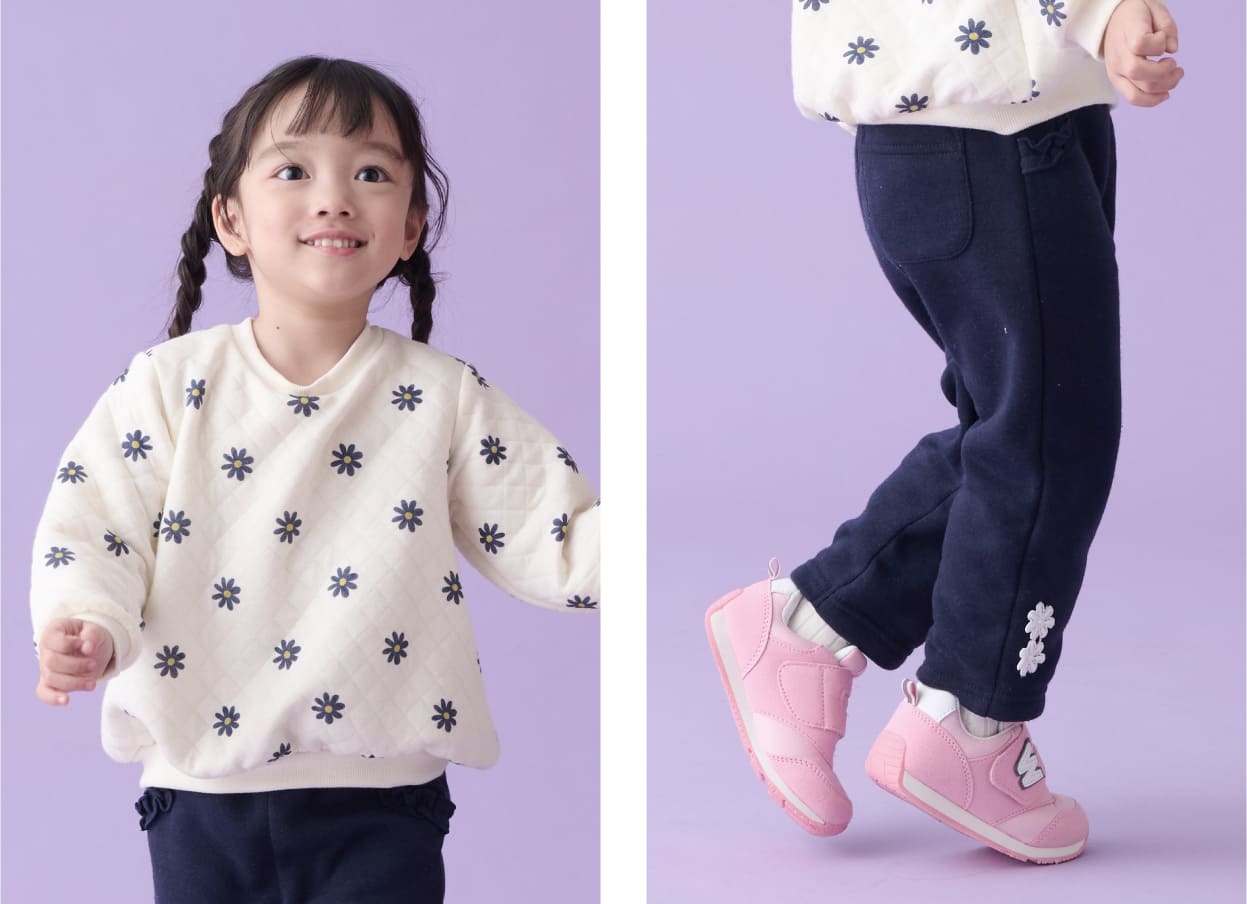 ふんわりとした肌触りの花柄トレーナーに、お花のモチーフを裾にあしらったパンツを合わせた女の子らしいコーディネート。パンツのポケット部分に付いたフリルもかわいい。