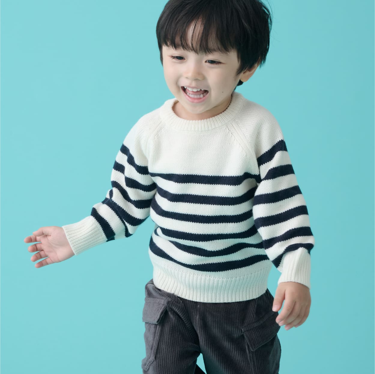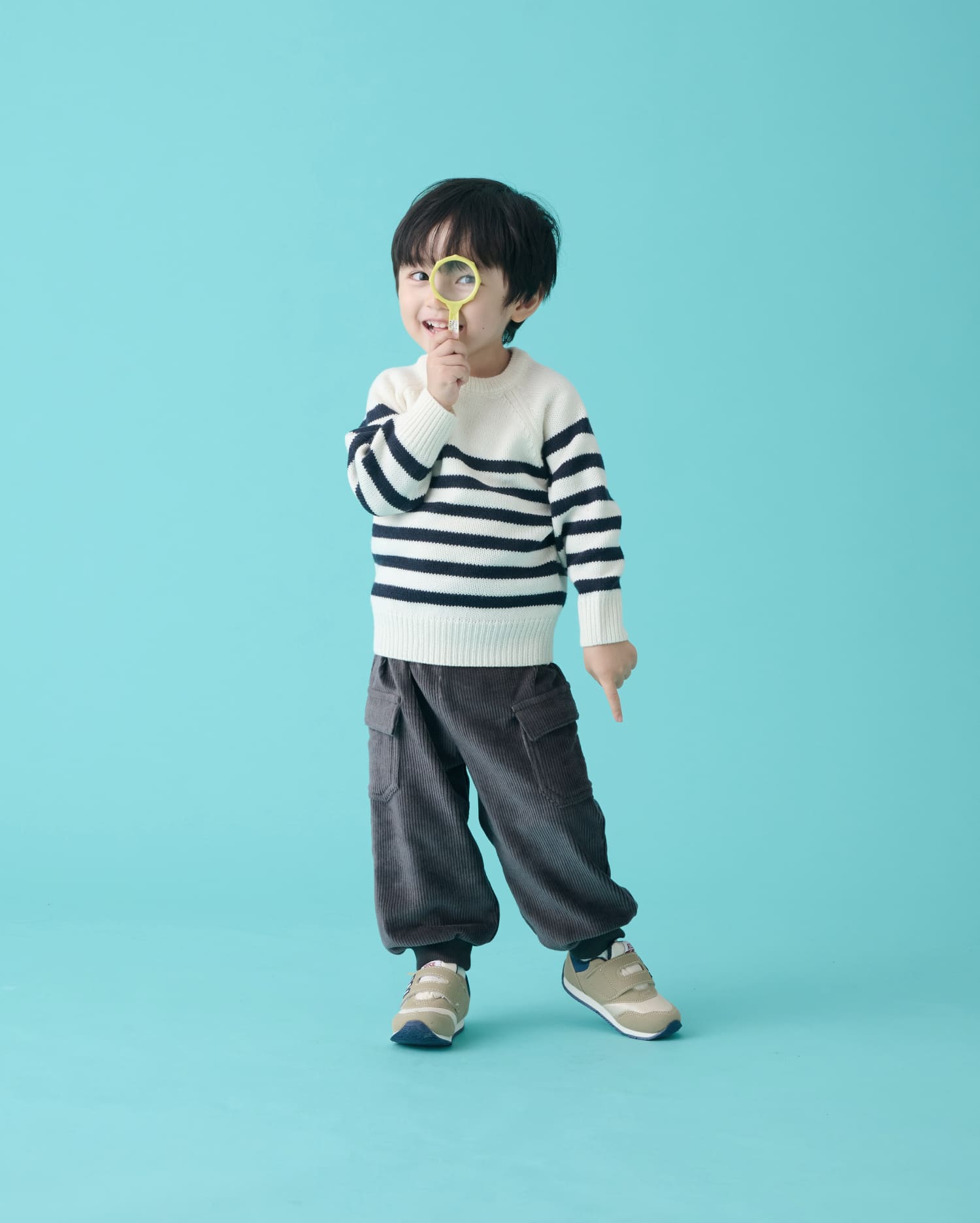程よくゆとりのあるボーダー柄のセーターにふんわりと柔らかいニットコーデュロイパンツを合わせた、カジュアルな冬コーデ。パンツは、サイドにあしらった大きなポケットがポイントです。