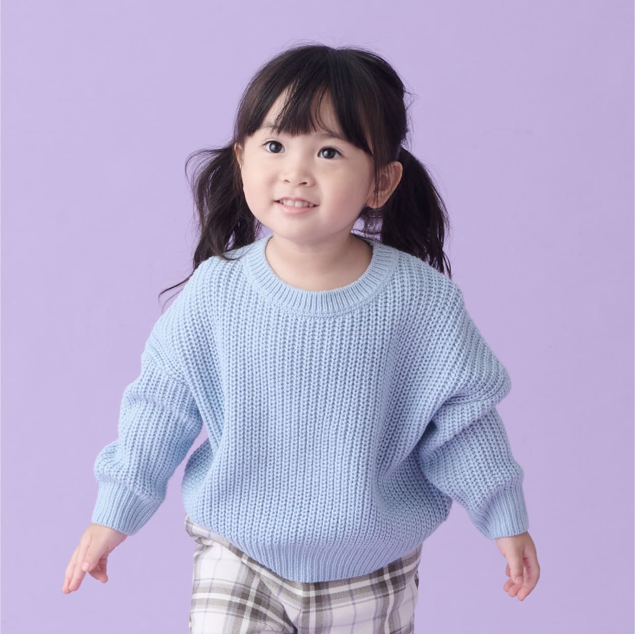 爽やかなブルーのニットは、ゆるっと着られる肩落ちシルエットがこなれ感たっぷり。秋冬シーズンにぴったりなチェック柄パンツを合わせて、きちんと感漂うスタイリングに。