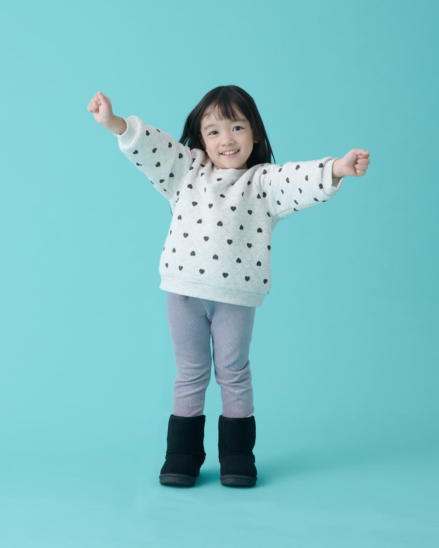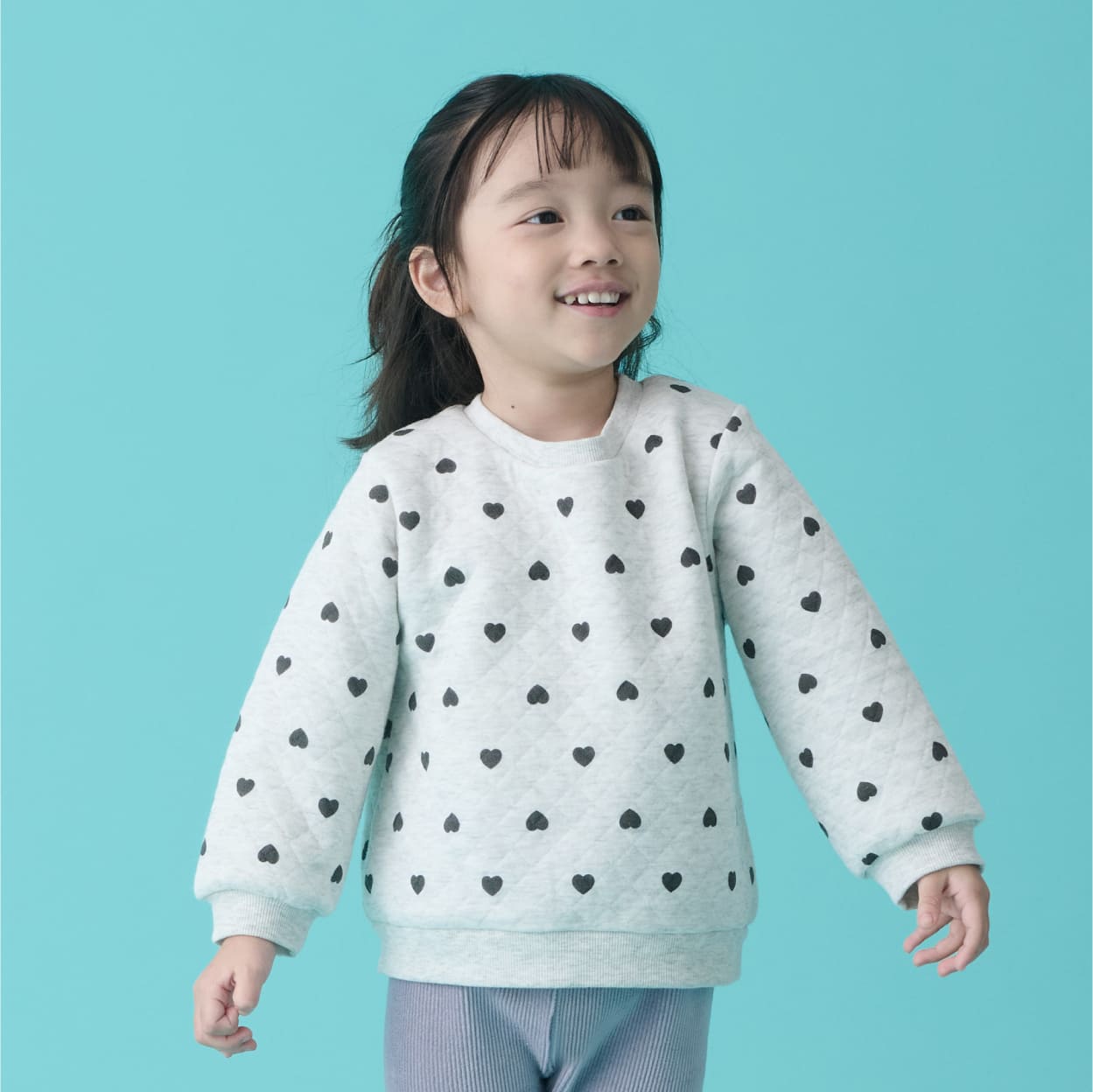軽量ながら保温性に優れたキルティング素材のトレーナーは、ハートを散りばめたガーリーなデザイン。ストレッチの効いた細身のニットコーデュロイパンツをチョイスして、動きやすい着こなしに。