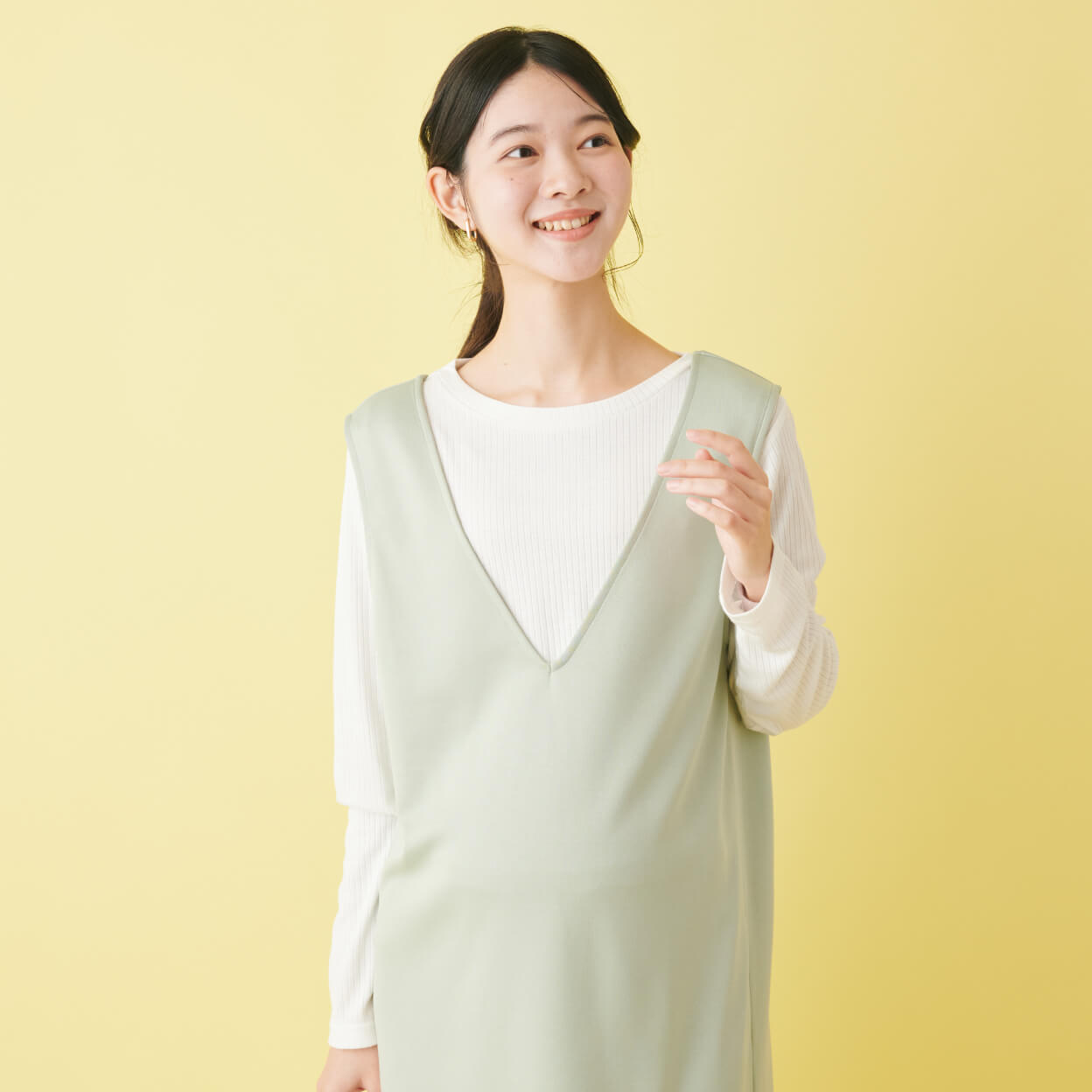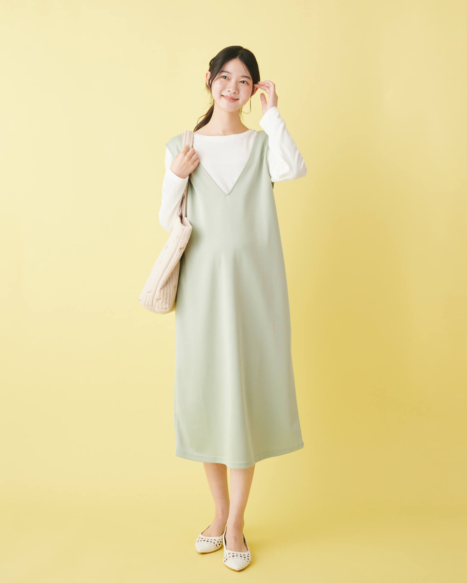 淡いグリーンの春らしいジャンパースカートは、深めのVネックデザインが顔周りをすっきり見せつつ、授乳のしやすさも叶えてくれます。Tシャツ付きなので、コーディネートもお悩み知らず。