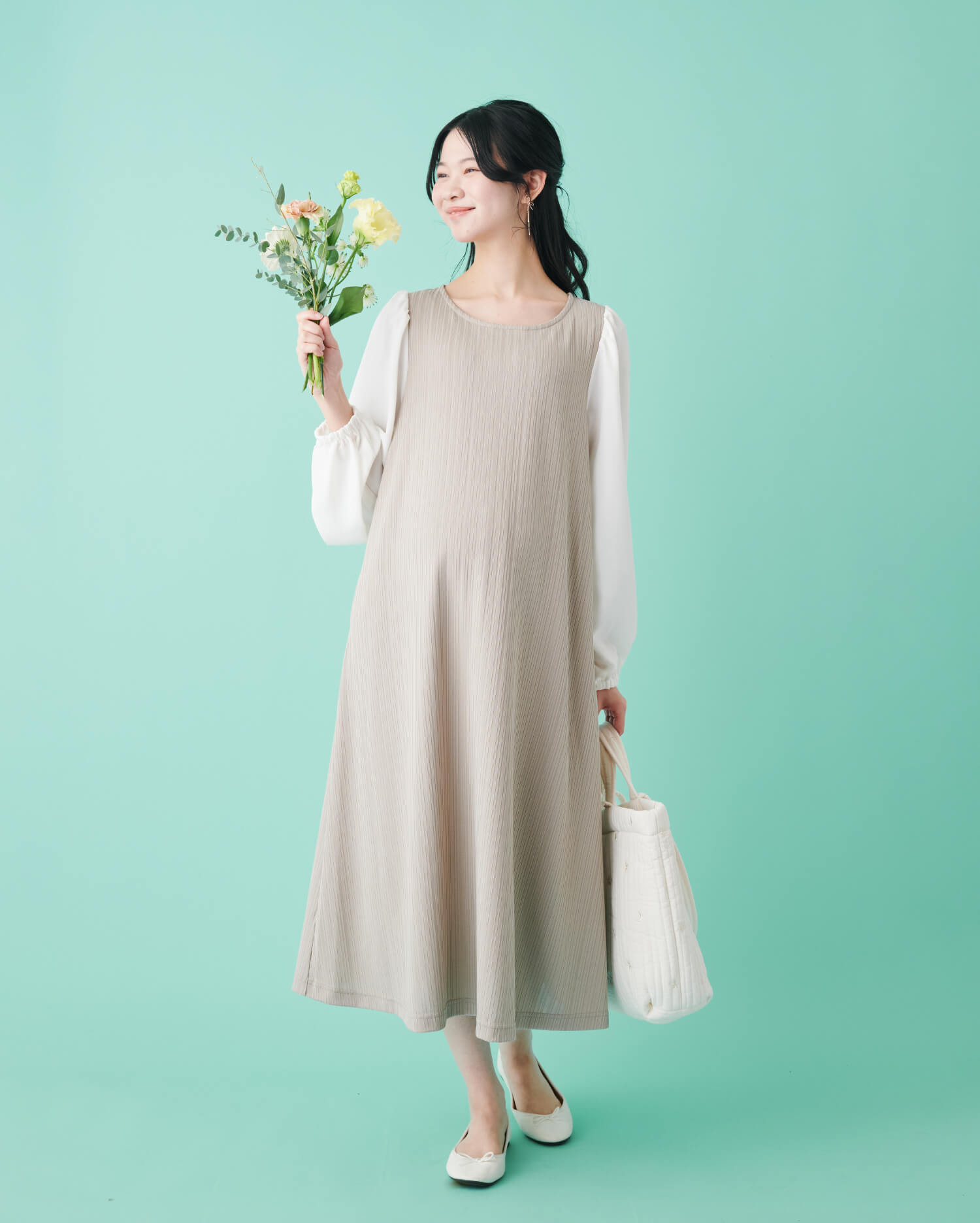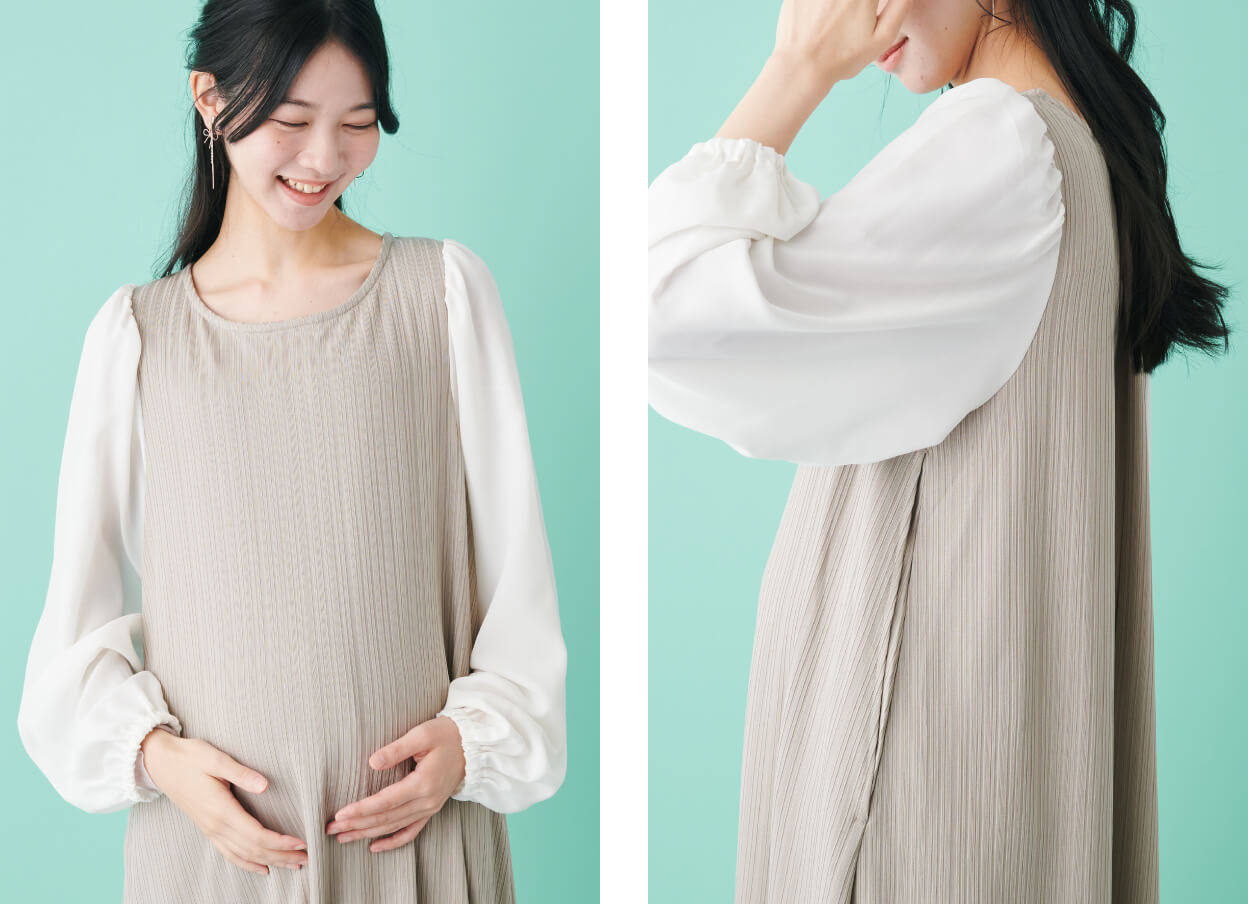 程よいボリューム感のあるパフスリーブが大人かわいい1着。体型カバーに最適なゆとりのあるシルエットや、おなかを締め付けず楽に過ごせるストレッチ素材がポイントです。