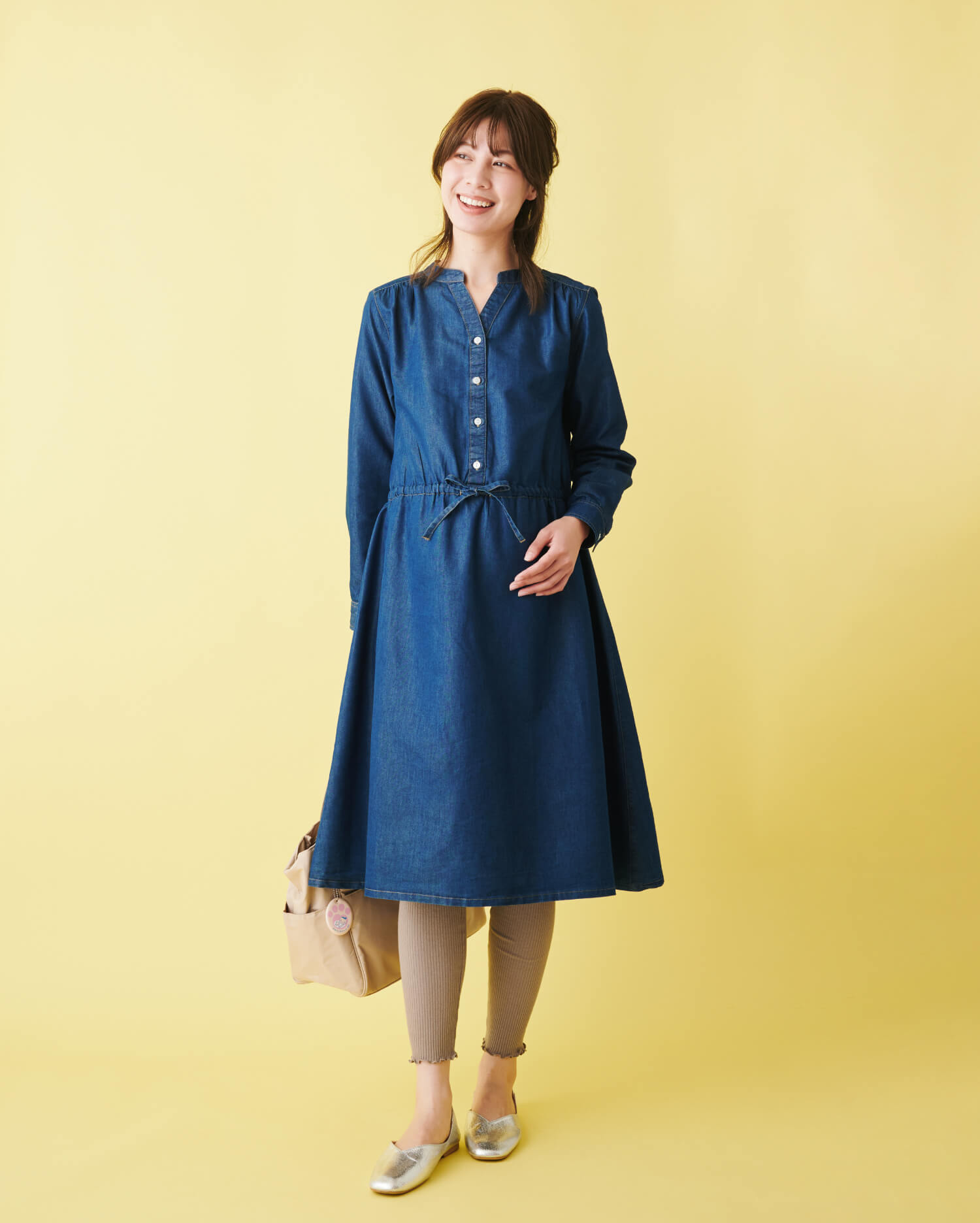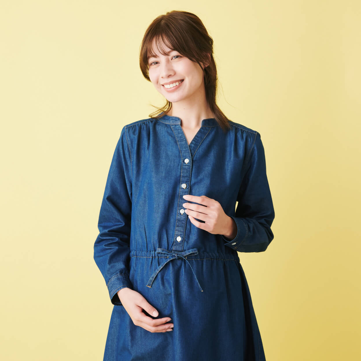 カジュアルに着られるデニムワンピは、体型の変化に合わせて使えるウエストリボン仕様。胸元のスキッパーデザインが抜け感を演出。ボタンを外せば授乳ができるから、産後にも重宝します。