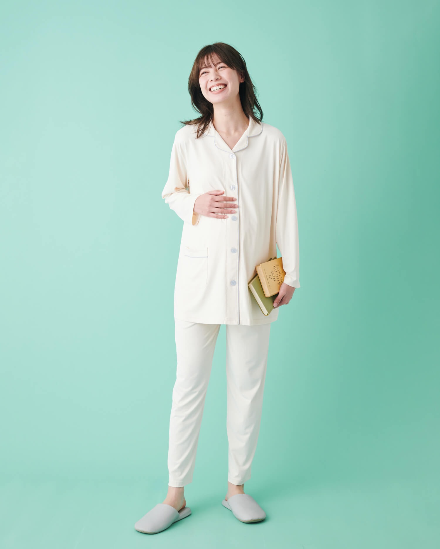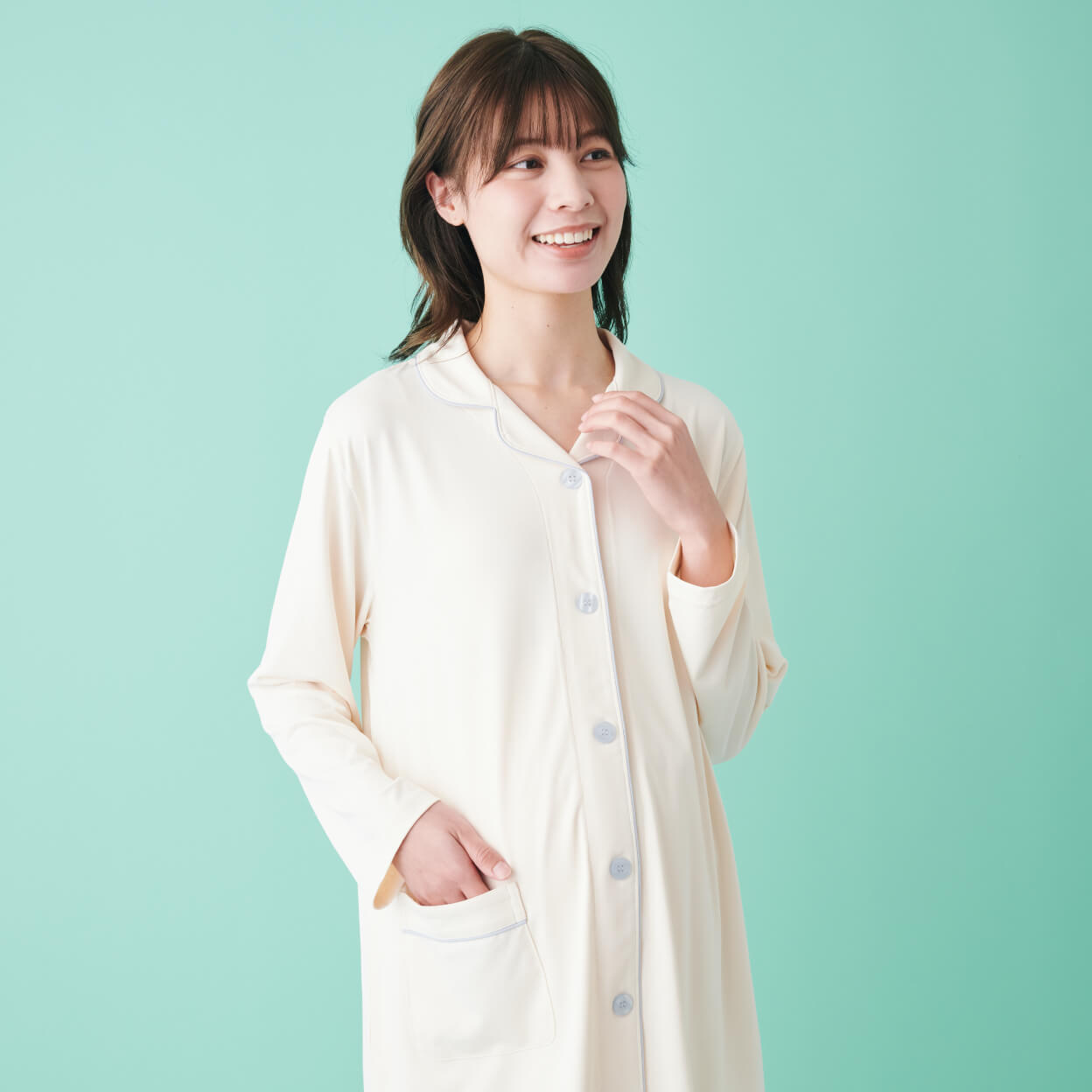 ブルーのパイピングがかわいいパジャマは、妊娠中の敏感肌にやさしいやわらかな肌触り。ボタンが大きめなので開閉しやすく、ポケット付きでスマホなどの持ち運びにも便利です。
