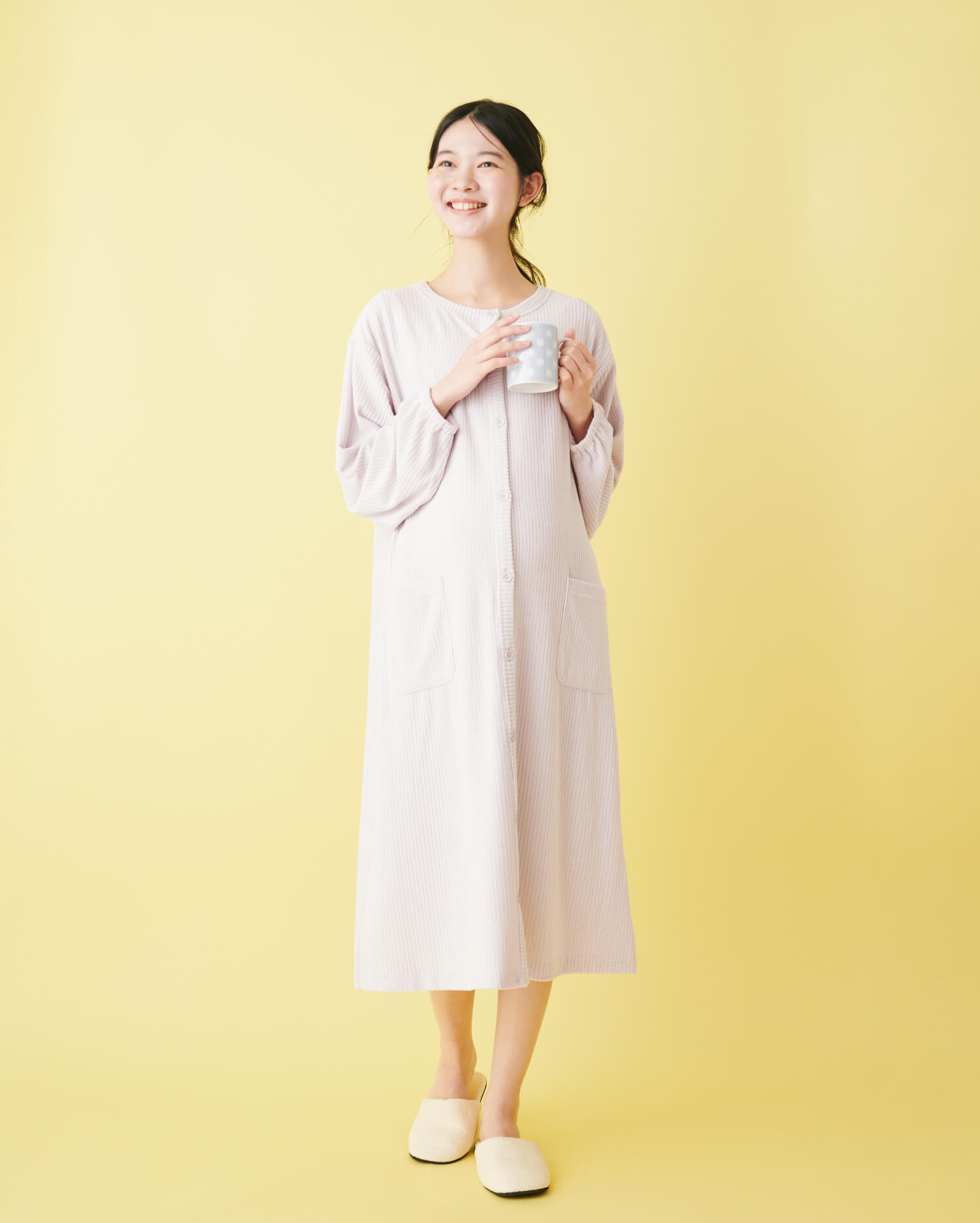 裾のめくり上がりを防ぎ、冷えをカバーする裾スナップボタン付きのパジャマワンピは、程よい伸び感のあるやさしい着心地。家事の邪魔にならない、袖ゴム仕様です。
