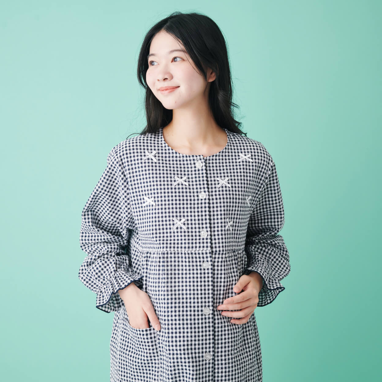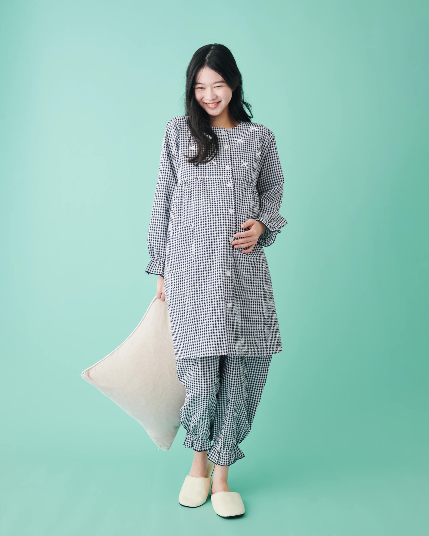 ギンガムチェックの生地に小さなリボンを散りばめた、心ときめくデザインのパジャマ。袖口と裾口はゴム入りで、ふんわり膨らんだシルエットが愛らしさを一層高めてくれます。