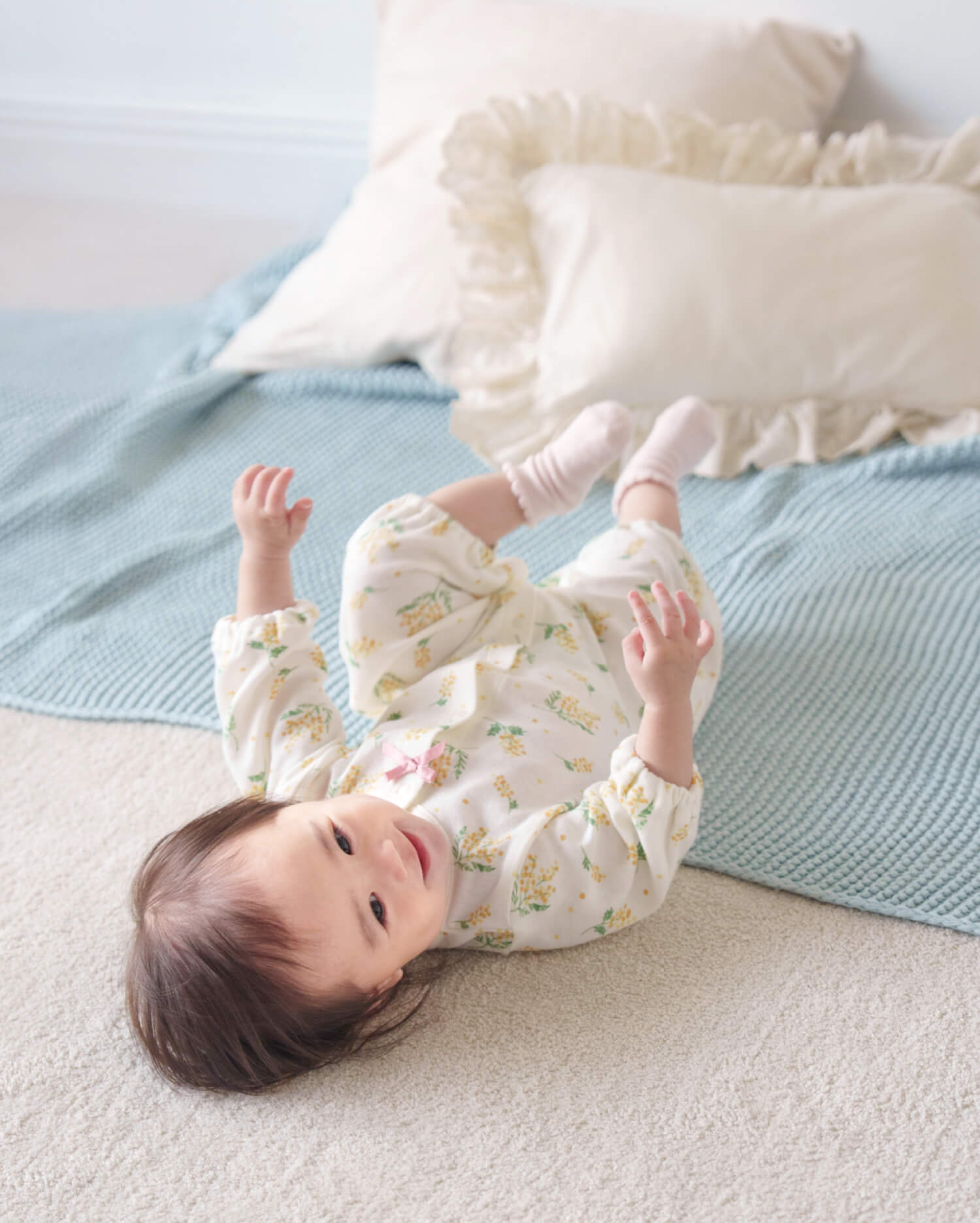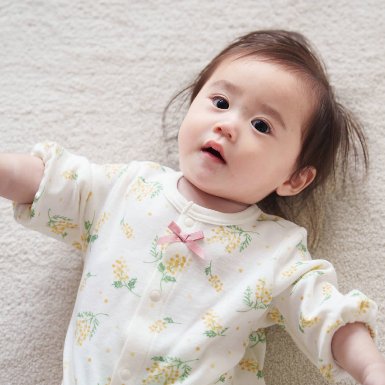 やさしい色使いとミモザ柄が春にぴったり。胸元にちょこんとあしらったリボンがかわいらしさを引き立てます。