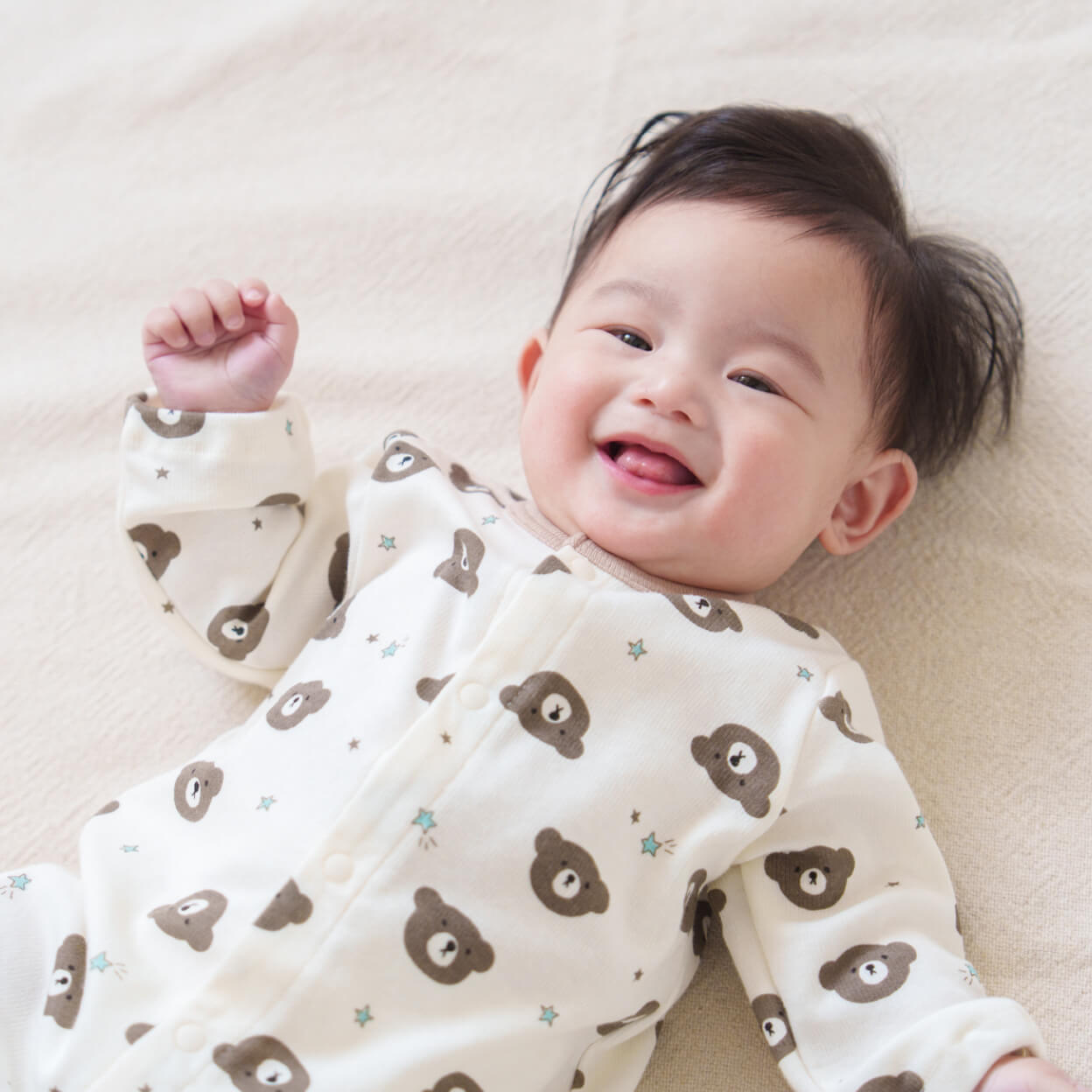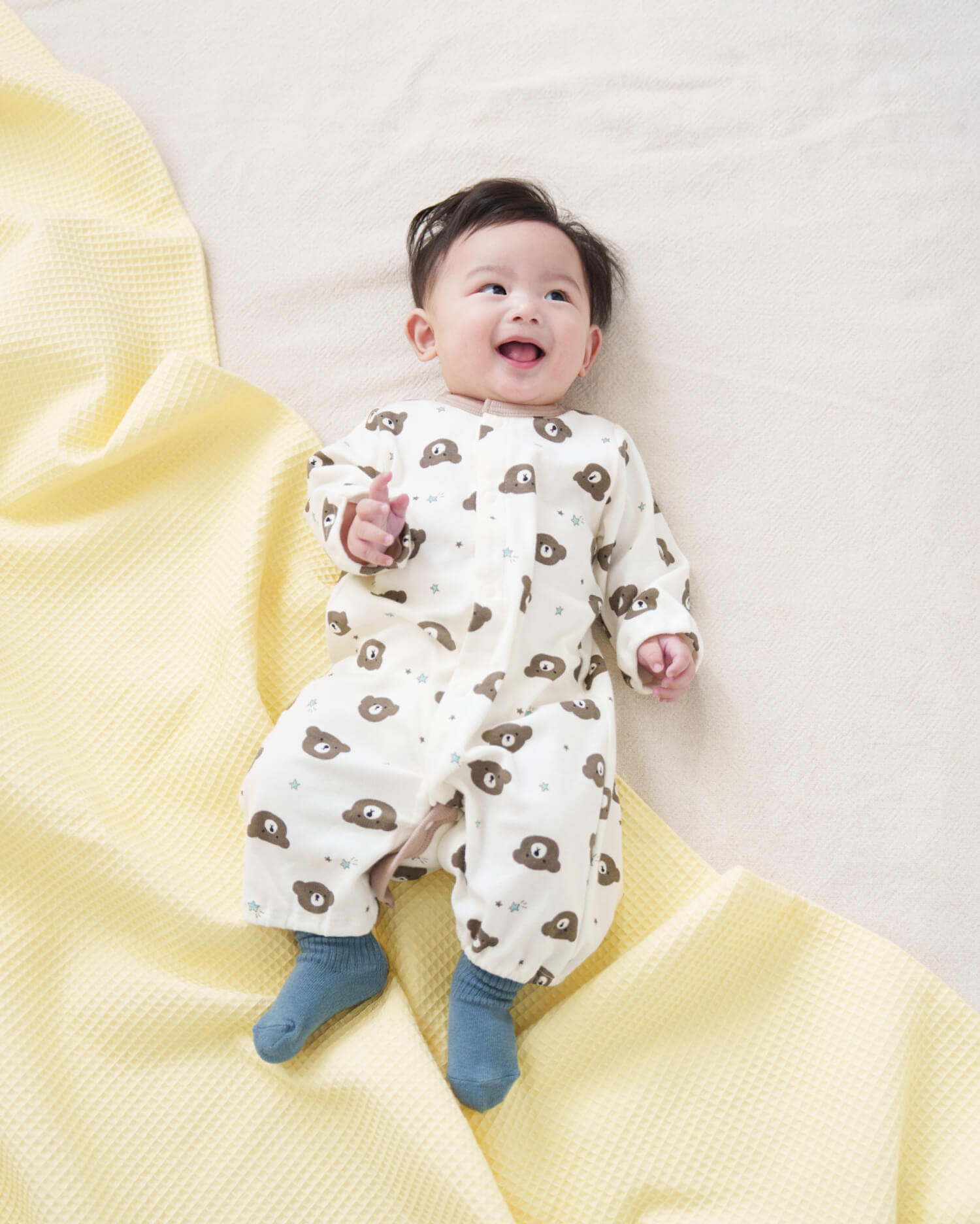 クマの総柄デザインがとってもチャーミング。首元にあしらったパイピングがさりげないアクセントになっています。