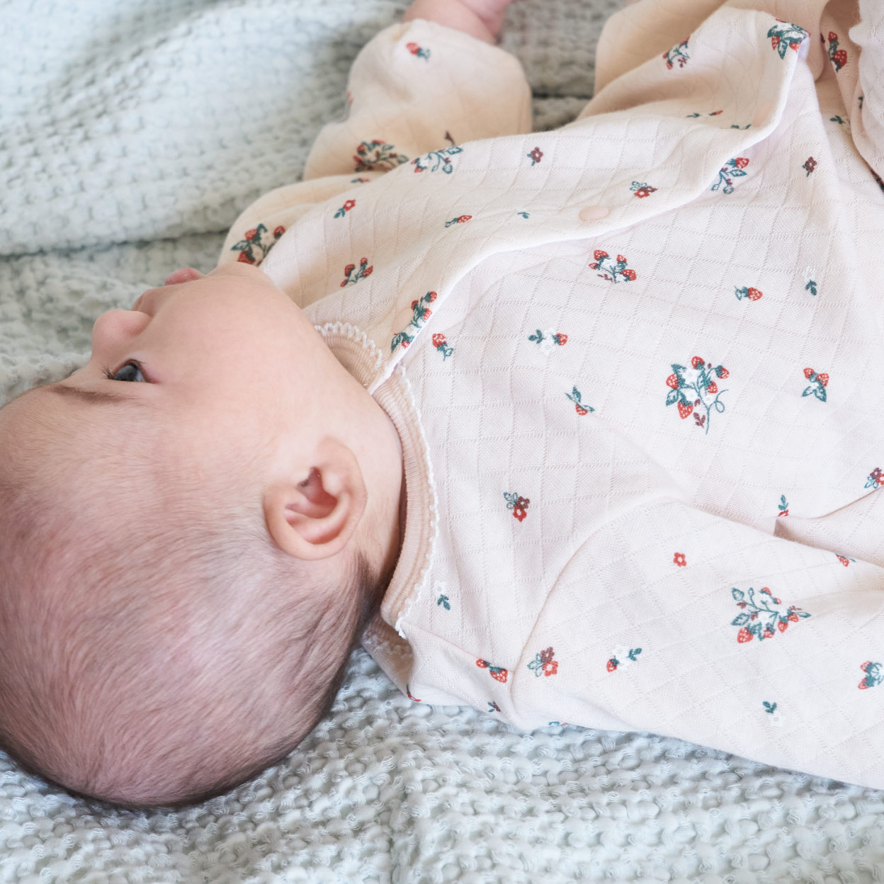 保温性に優れた、軽くてやわらかなキルティング素材。イチゴの総柄が愛らしさ満点で、首周りのレースがかわいいアクセントに。