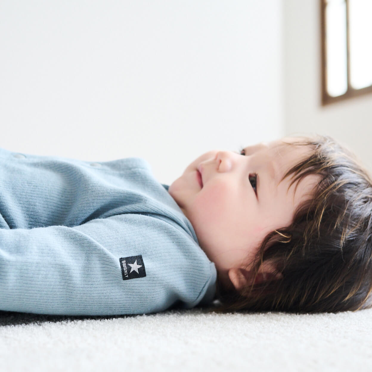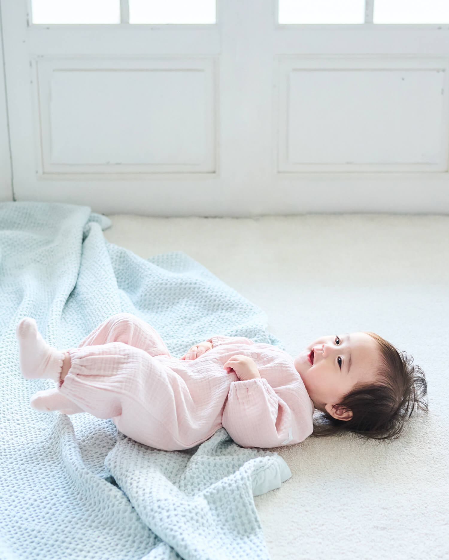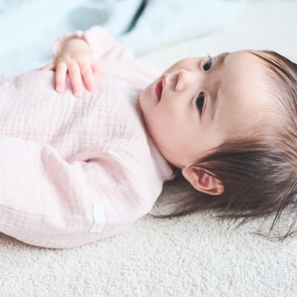 吸水性・通気性が高く、ふんわりとした肌触りのモスリンガーゼを使用。左肩のチケットでさりげない可愛さをプラス。
