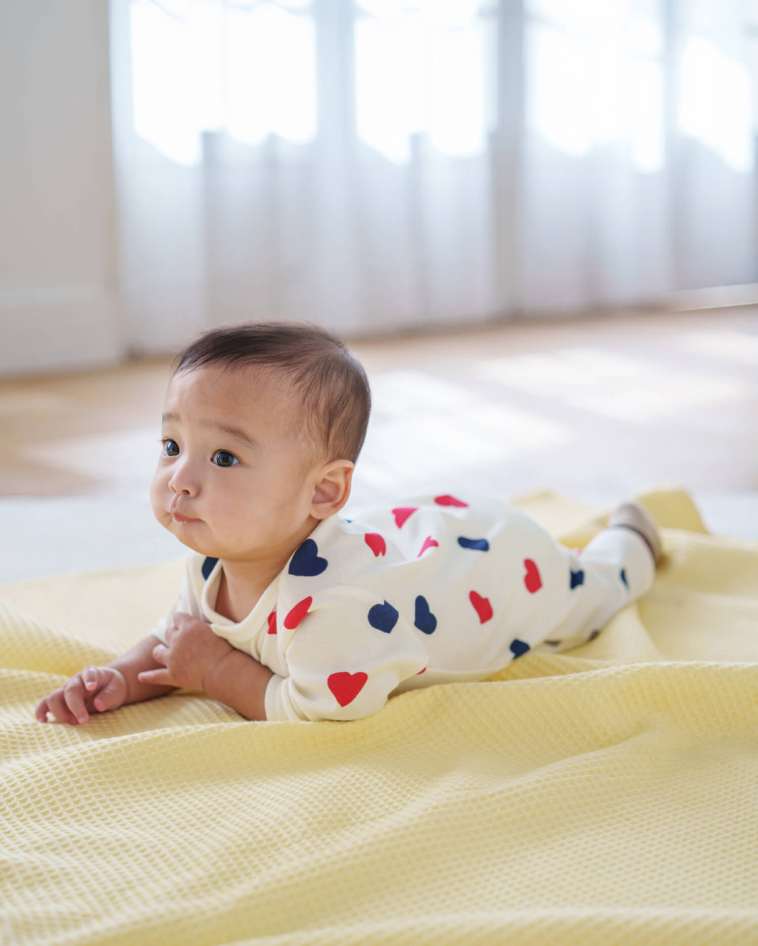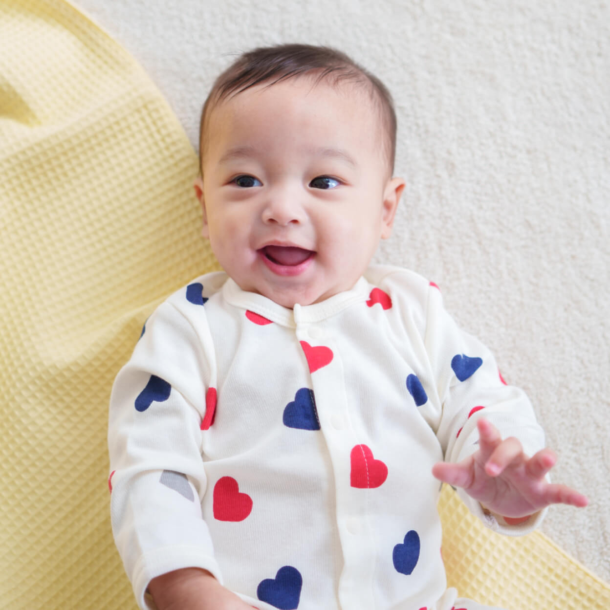 トリコロールカラーのハート柄が目を引くプレオール。かわいらしさの中に洗練された雰囲気が漂います。