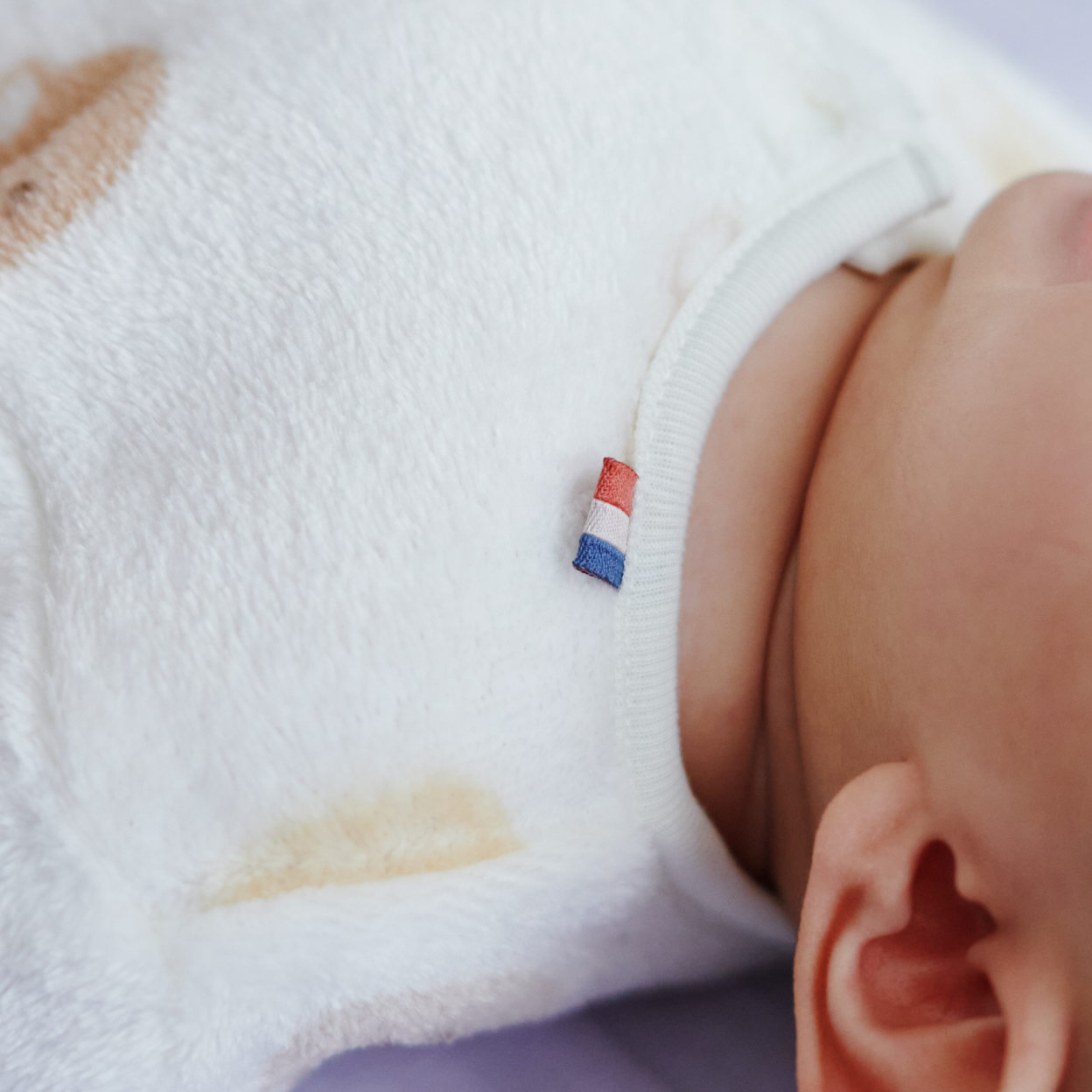 クマの総柄がかわいいプレオールは、首元のピスネームもポイント。ふわふわのフラノ生地に包まれて、赤ちゃんもにっこり笑顔に。