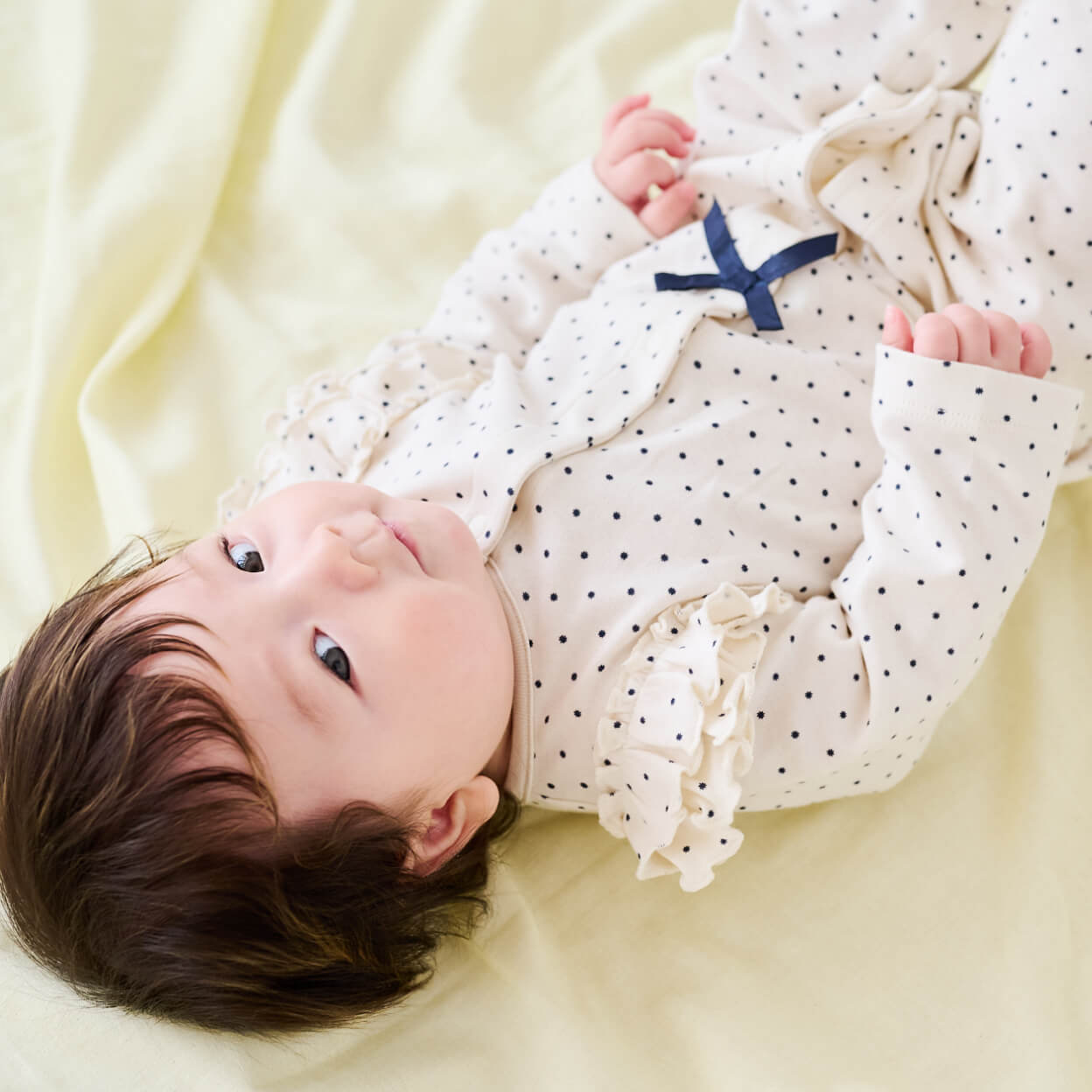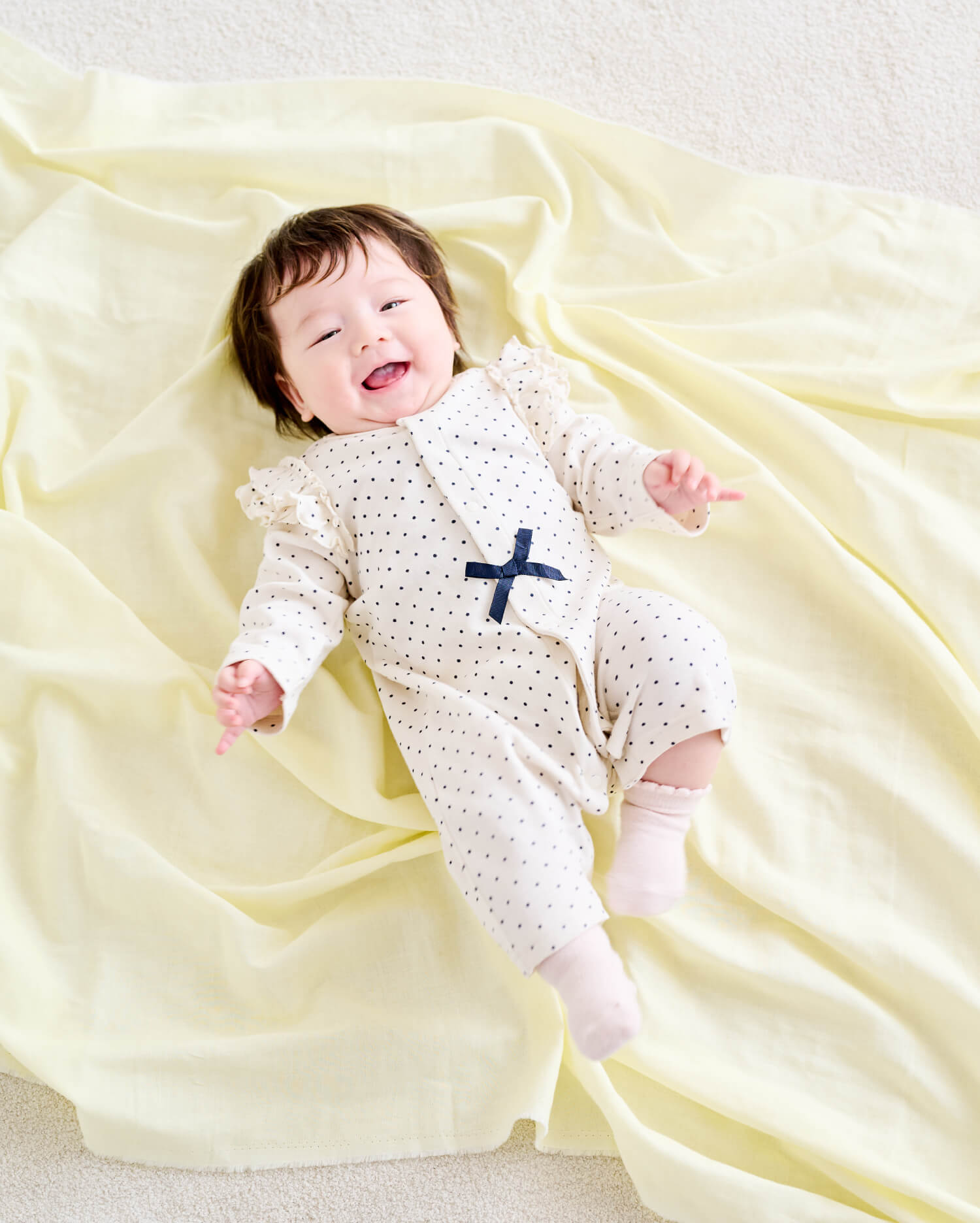 肩に広がるフリルやフロントのリボンが愛らしいドット柄のプレオールは、心が浮き立つ春のお出かけにぴったり。