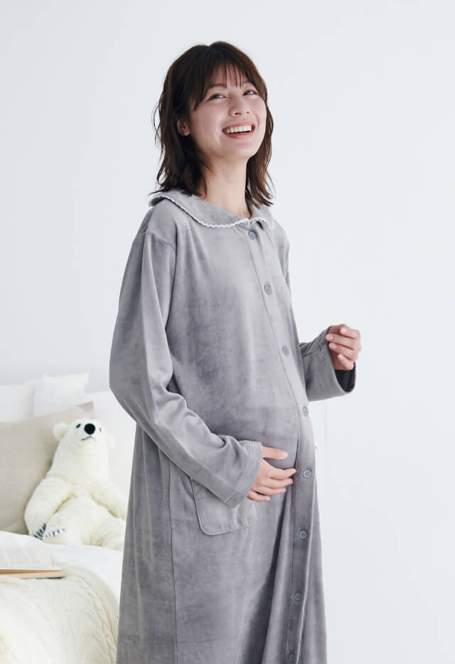 細部まで工夫が施され、体型の変化に寄り添ってくれるマタニティパジャマ。パンツをはかずに 1 枚でも着られる長めの着丈のものや入院中の診察&処置がスムーズにできるもの、パンツのウエストを調節できるものを用意。産後も使える授乳口付きのアイテムも豊富です。