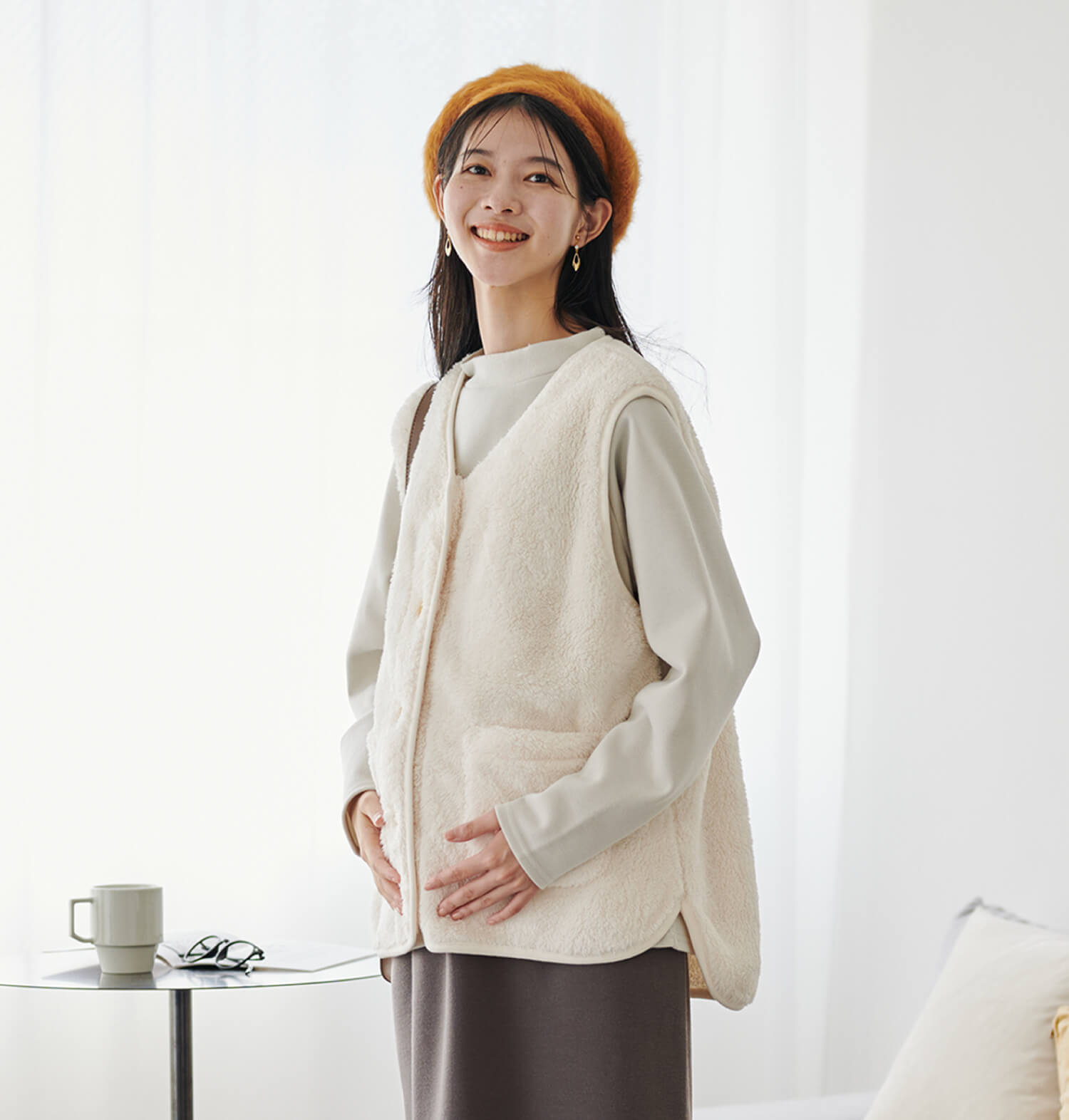 防寒や体型カバーに最適なボアベストを主役に、授乳口付きのトップスと産後は折り返して着られるウエストリブスカートを組み合わせた、あったかかわいいコーディネートです。