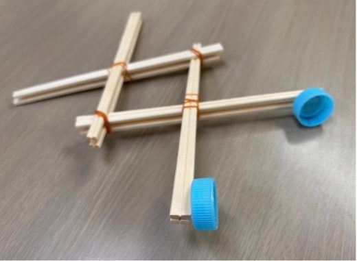 1.割り箸4膳を交互重ね十字にし、真ん中を輪ゴムで留める(※きつく留めると動きが悪くなるため、ゆるめに留める)