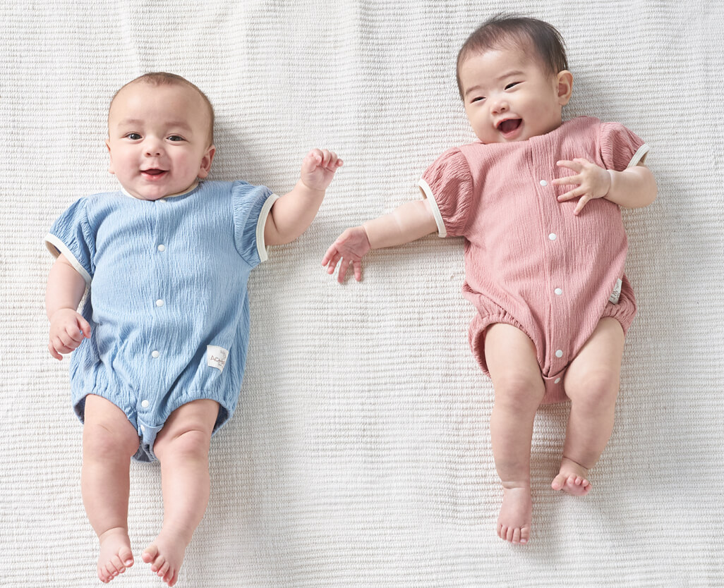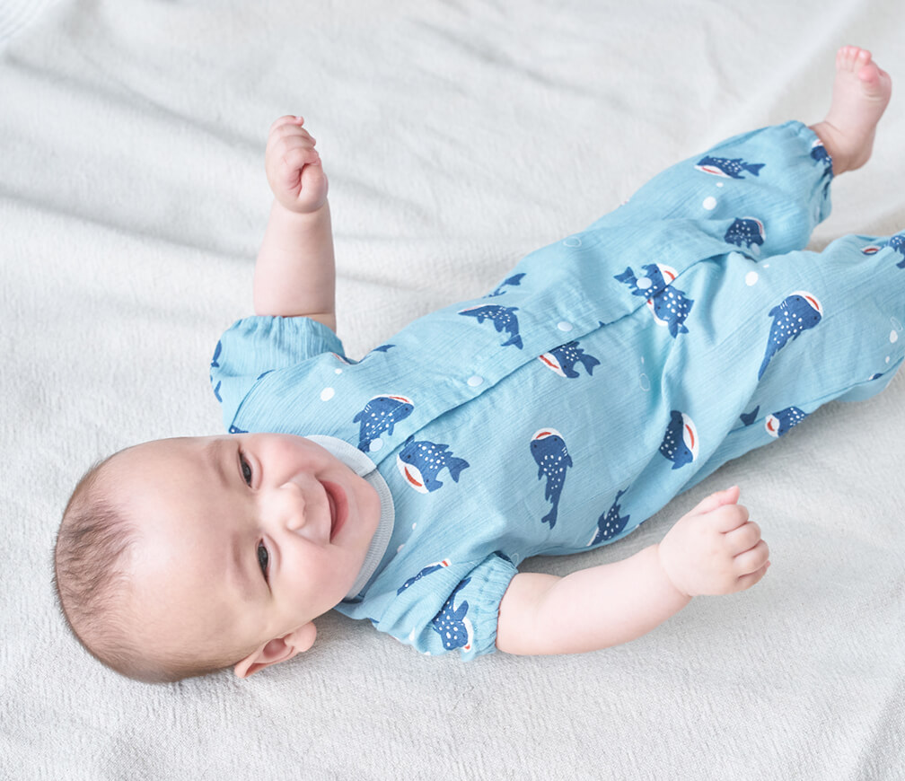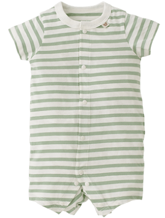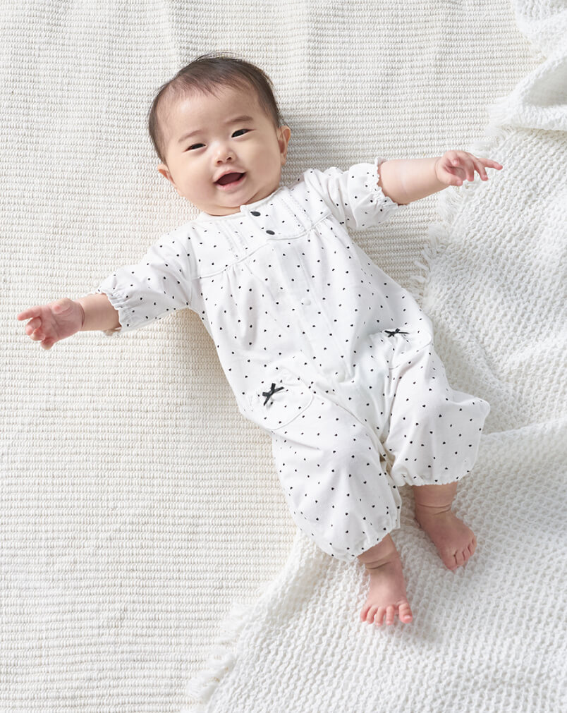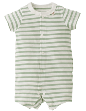 袖や裾を短めに仕立てた低月齢の赤ちゃん向けのカバーオールです。やわらかな素材感や赤ちゃんが自然な姿勢で過ごせるデザインをご用意。夏は丈の短いロンパースタイプもおすすめです。おむつ替えの時に慌てないよう、スナップボタンは留めやすい日本製を採用しています。