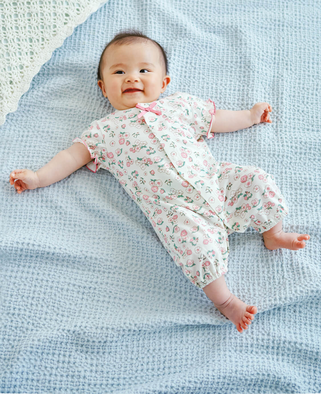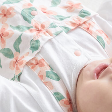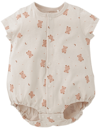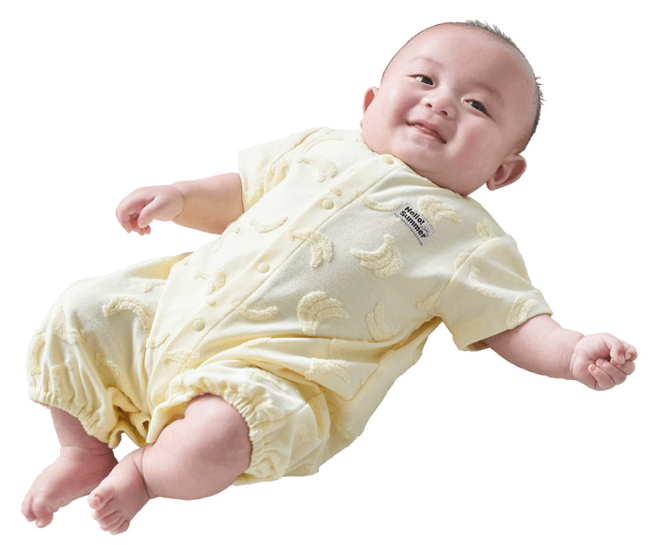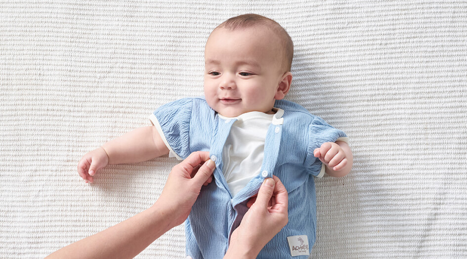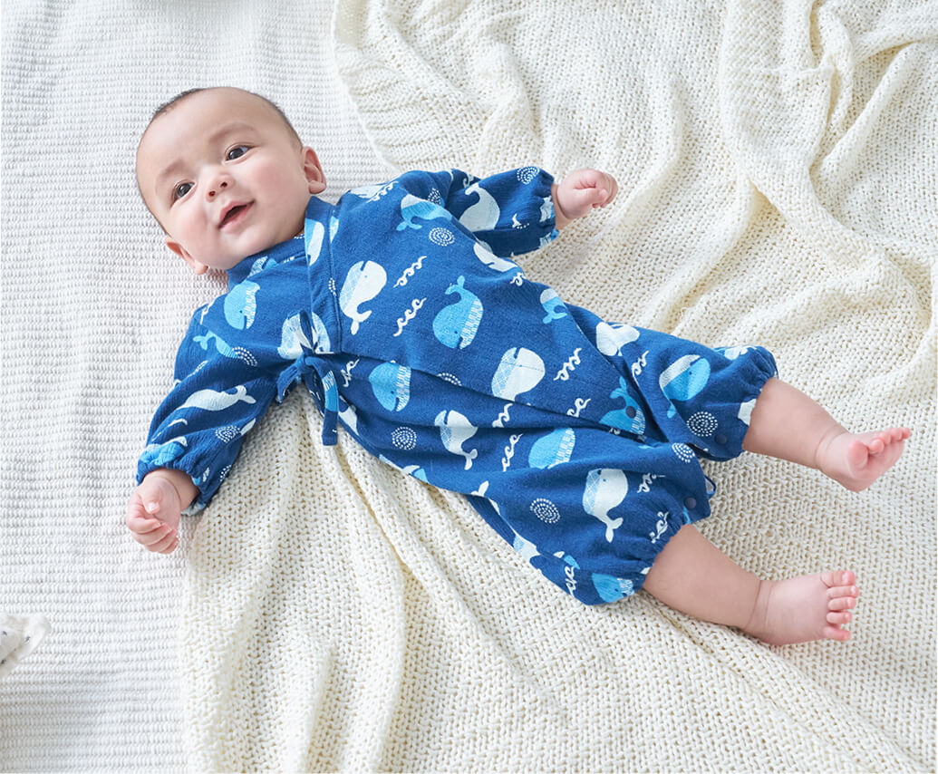 袖や裾を短めに仕立てた低月齢の赤ちゃん向けのカバーオールです。やわらかな素材感や赤ちゃんが自然な姿勢で過ごせるデザインをご用意。夏は丈の短いロンパースタイプもおすすめです。おむつ替えの時に慌てないよう、スナップボタンは留めやすい日本製を採用しています。