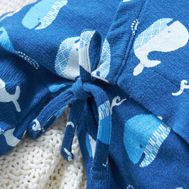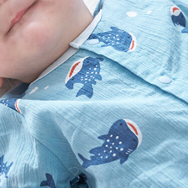 ブルーを基調にしたジンベエザメの総柄が涼しげなデザイン。赤ちゃんの肌をやさしく包んでくれるコットン100%です。