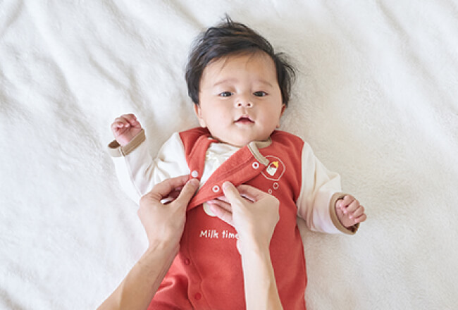 前開きタイプは、赤ちゃんを寝かせた状態でお着替えできるのが特徴で、赤ちゃんを座らせたり首を持ち上げたりする必要がないため、着替えやすい仕様になっています。