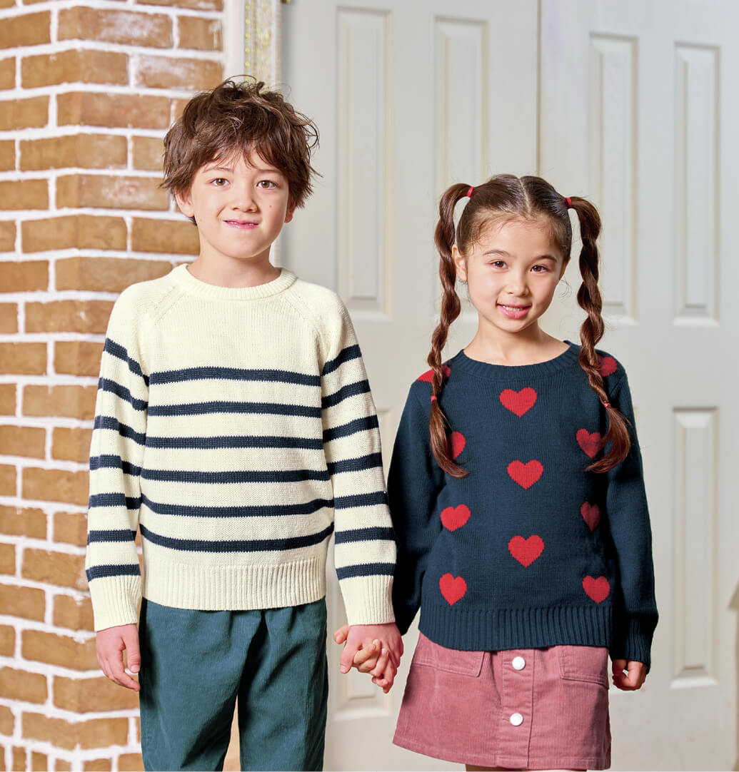 西松屋には、選ぶのが楽しくなる柄ものアイテムもいっぱい。存在感のあるハート柄セーターに厚手のスカートを合わせれば、キュートなコーデが完成。秋冬のお出かけも可愛く決まります。